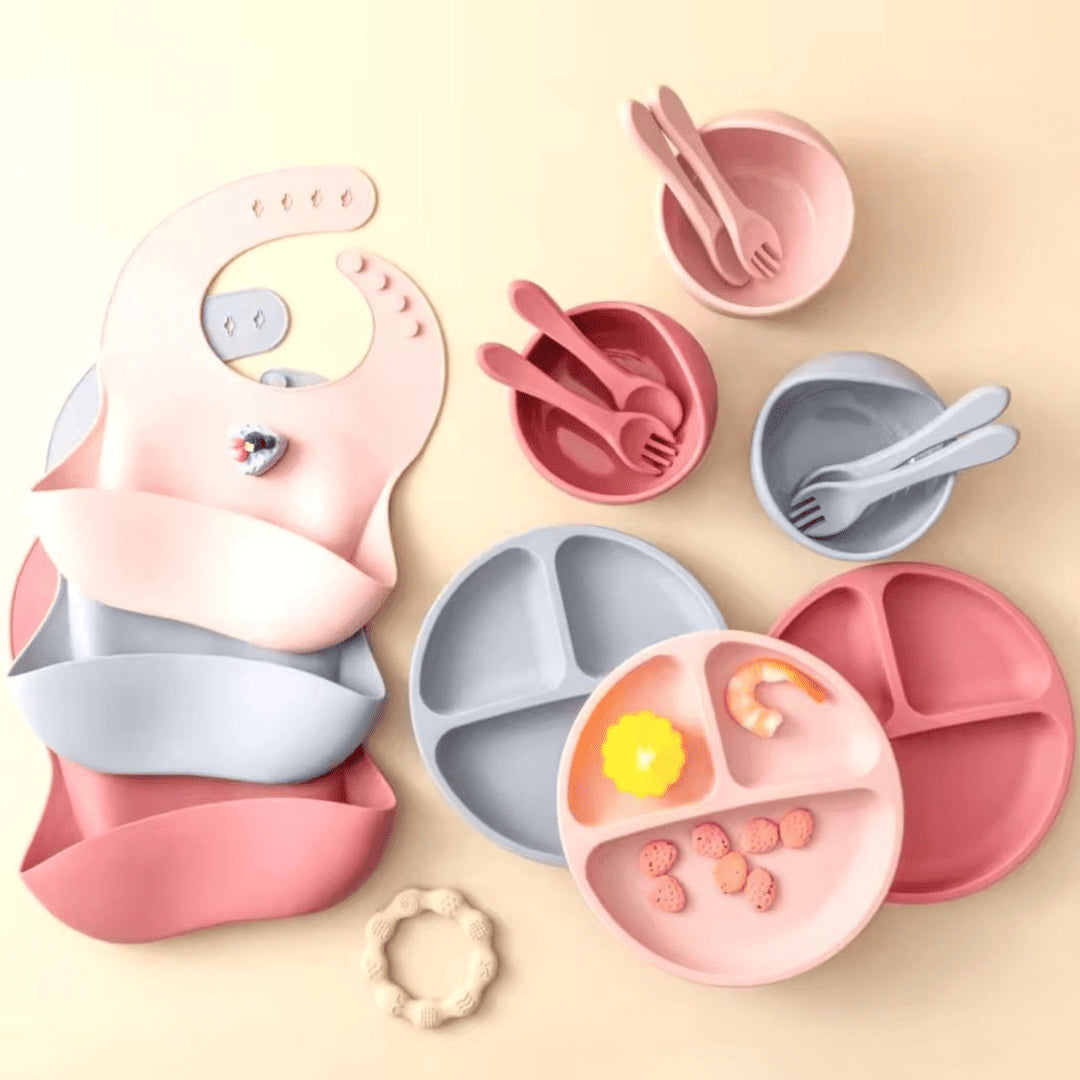 Nuestro set esta elaborado con silicona libre de BPA, PVC, garantizando la máxima seguridad para tu bebé, con base de succión que evita que los platos terminen en el suelo, ya que se adhieren a cualquier superficie.
