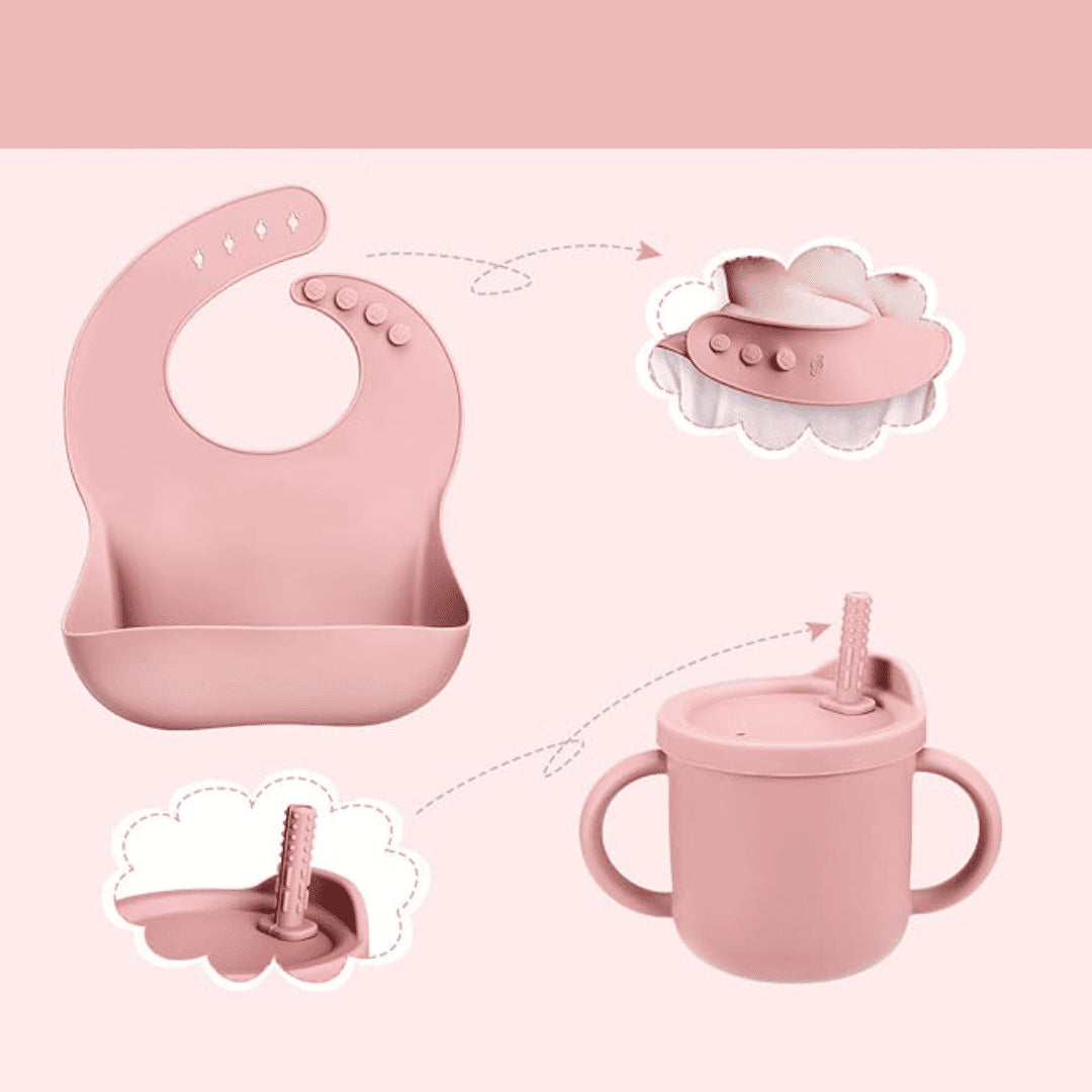 Este set incluye todo lo que necesitas: platos divididos, utensilios ergonómicos, vaso con pitillo y un babero con bolsillo profundo que atrapa los derrames, acompaña a tu bebé en su desarrollo.